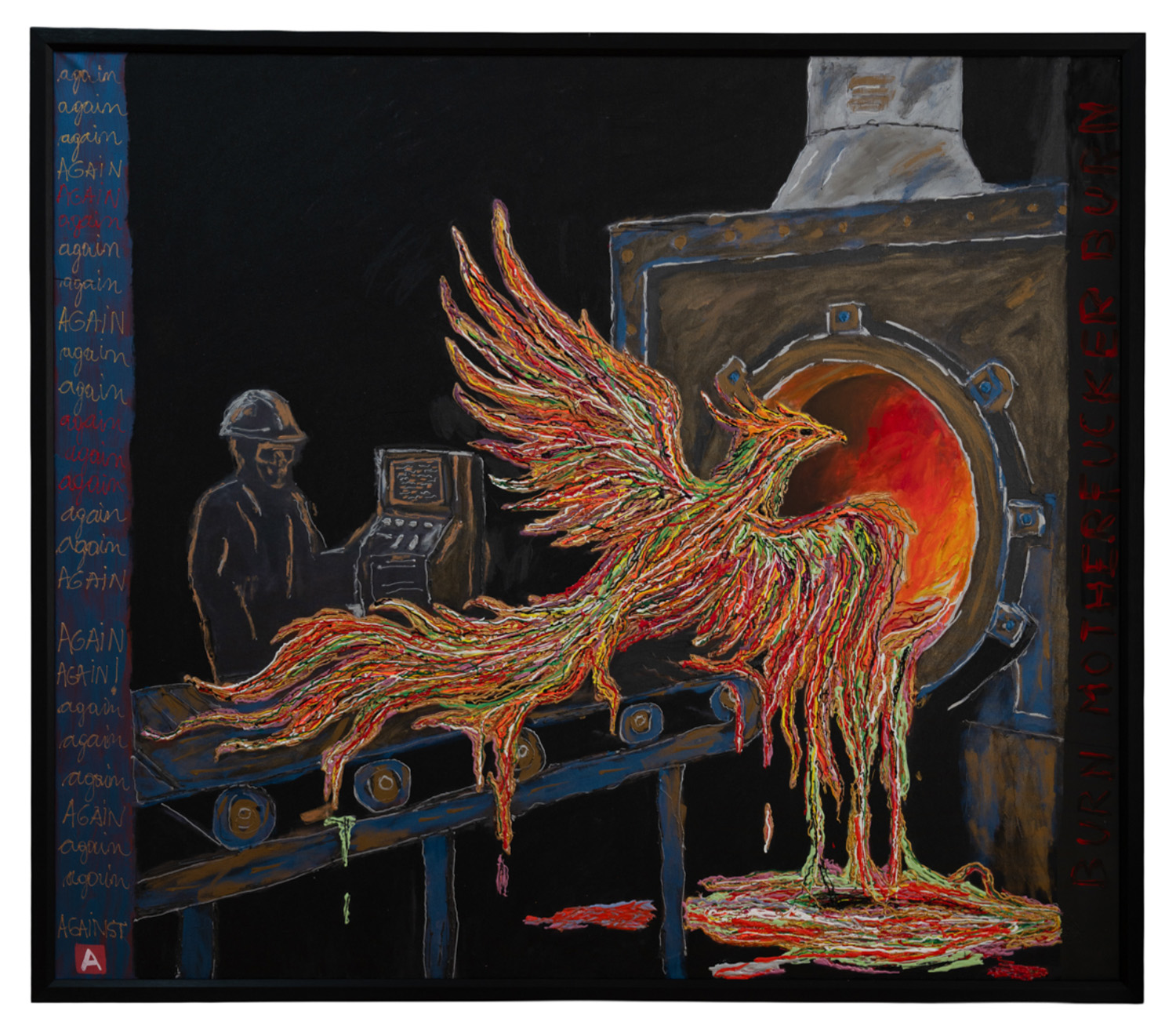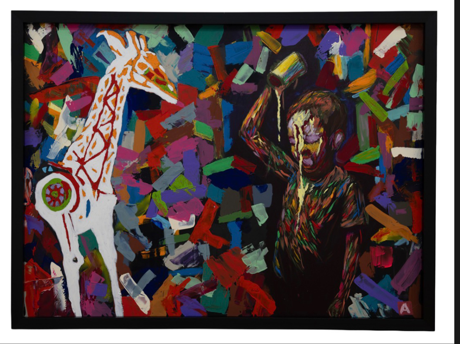 His influences are visible but not derivative: the emotional intensity of German Expressionism, the religious confrontation of Francis Bacon, the saturated chaos of Neo-Expressionists like Basquiat and Schnabel.