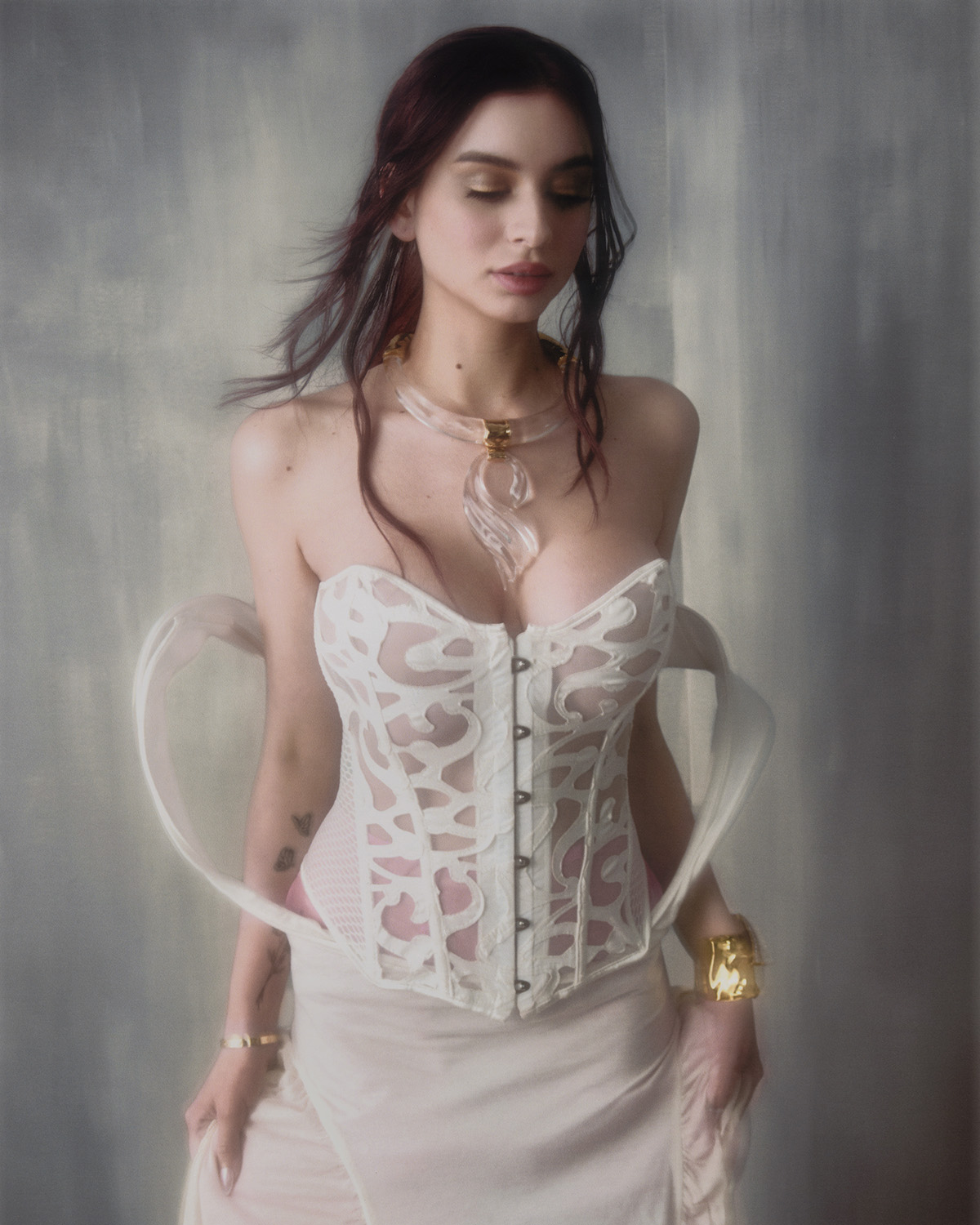 Corset: Erickson Beamon @ericksonbeamon at @showroomseven Dress: Tongying Matilda Liang @t_liang_t Bracelet right & Necklace: Alexis Bittar @alexisbittar Bracelet left: bracelet: Erickson Beamon @ericksonbeamon at @showroomseven