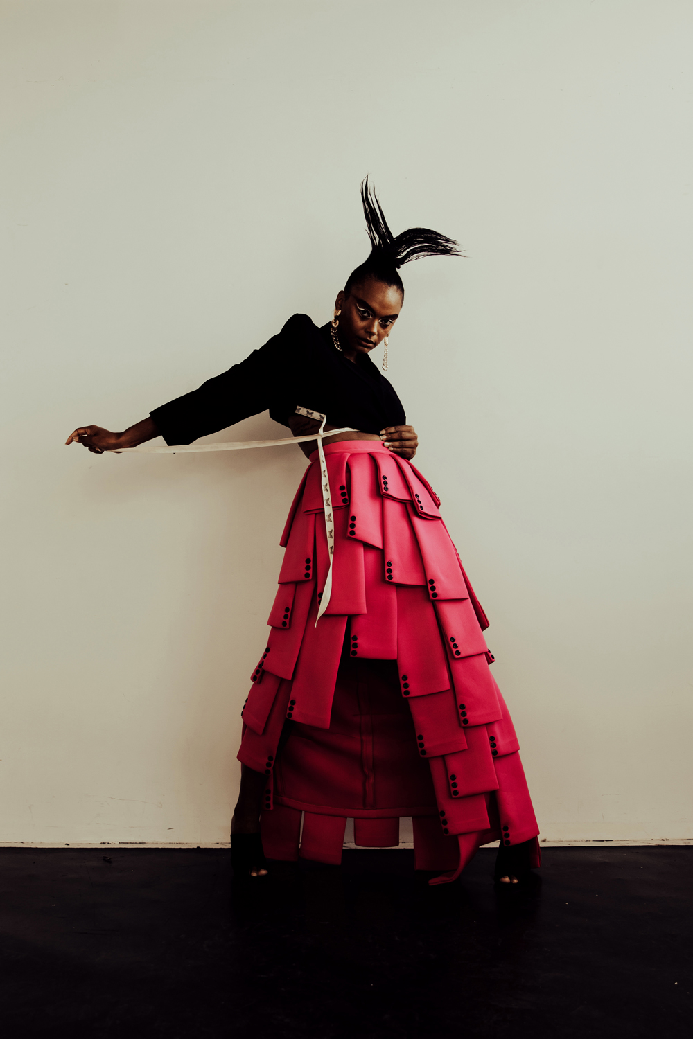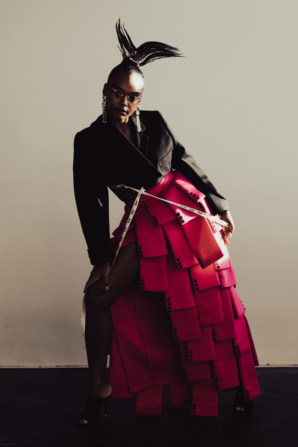 Jacket Y-Y Official Skirt: Uche by Amber Shoes: Beautiisoles by Robyn Shreiber Earrings: Cristina Sabatini