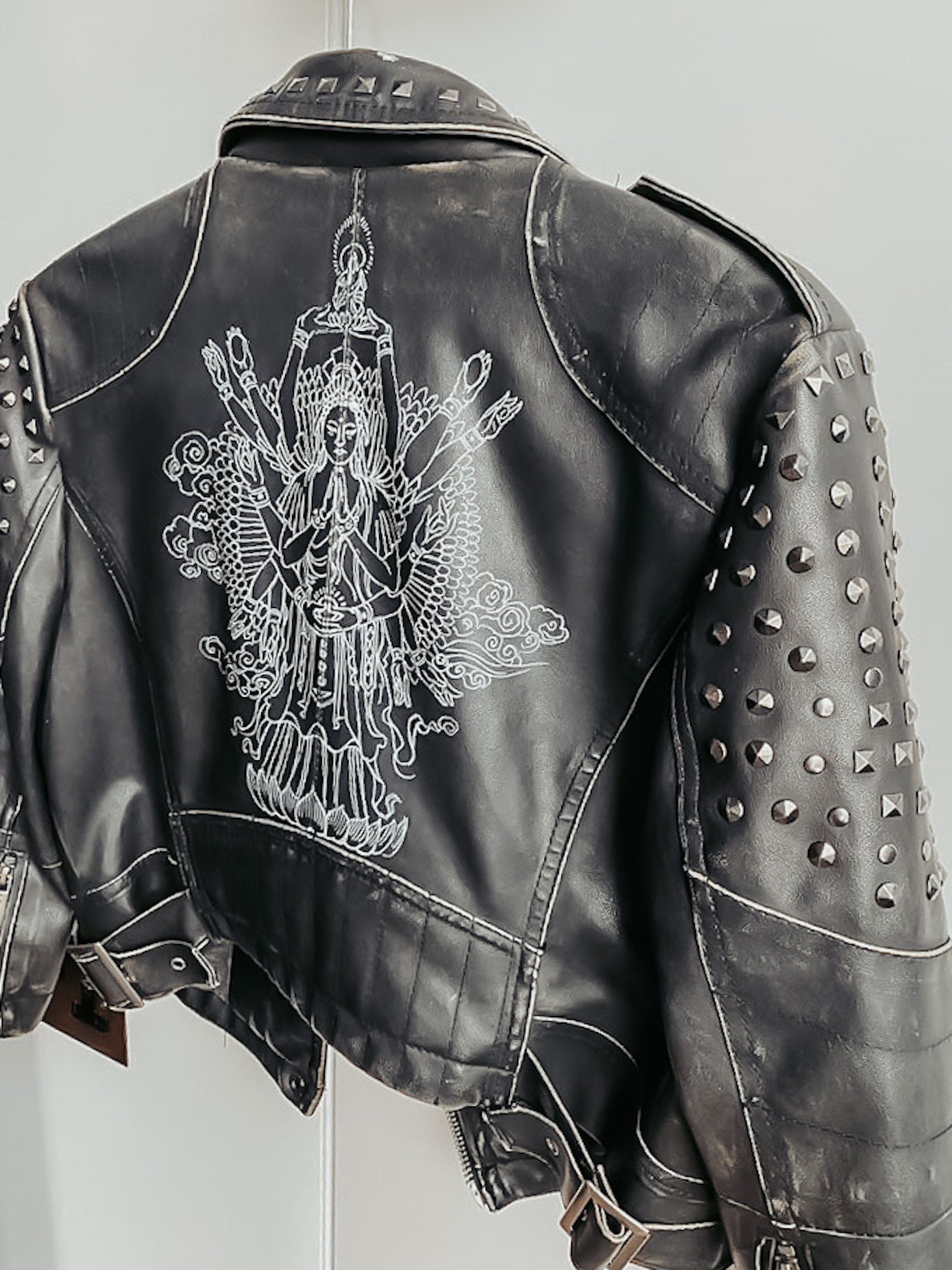 It took me years to find a second hand leather jacket that has that super cropped feel and this one came to me at a vintage shop in Bath [Somerset, England]. I bought it immediately and later as a birthday present, my boyfriend who is an artist, drew the design of the Thousand Hand bodhisattva on the back. She is a Chinese deity known as “the one who perceived the sounds of the world.”